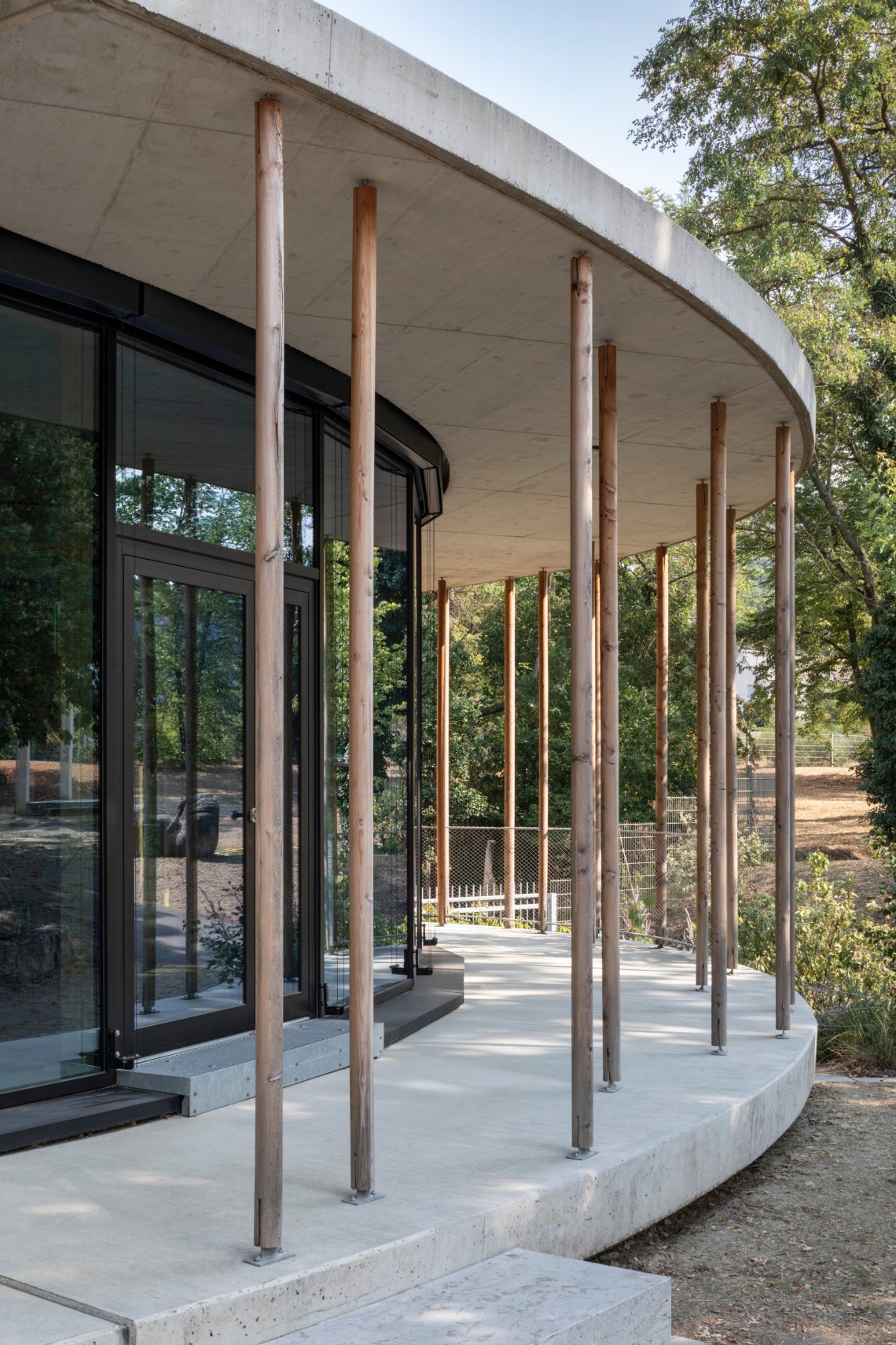 Die filigranen Rundhölzer aus unbehandelter Lärche, die den balkonartigen Umgang fassen, sollen den Eindruck eines leichten Baukörpers noch unterstützen.