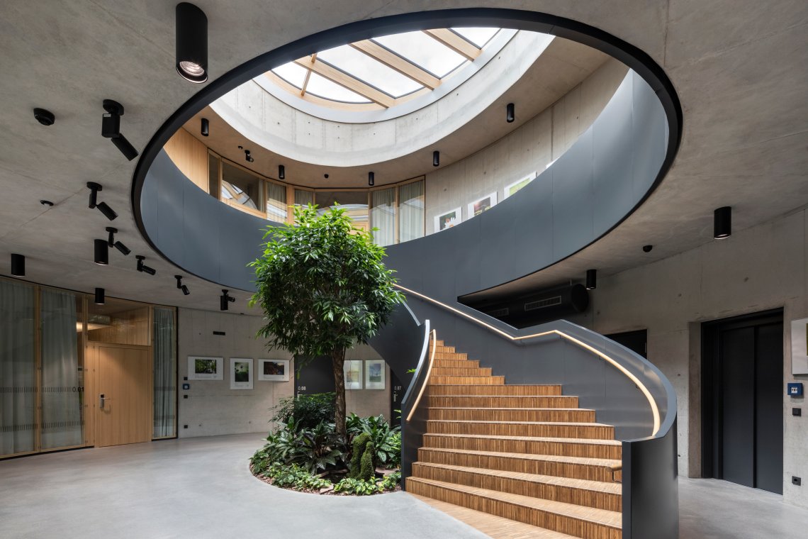 Über eine gewendelte Treppe gelangt man in das erste Obergeschoss, wo sich Büros, Seminarräume und ein Vortragsraum befinden.